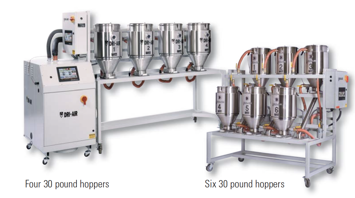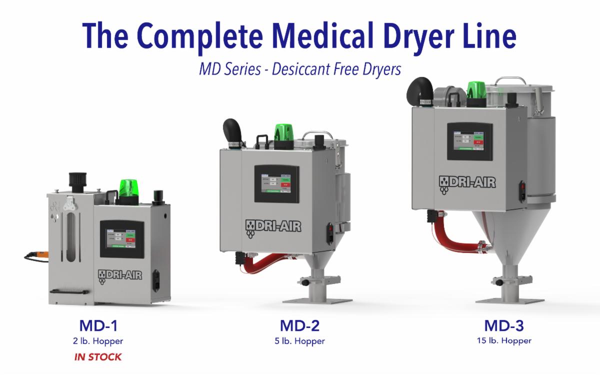 | The MD series is a line of sleek, compressed air dryers designed for very low throughputs and high value resins. These desiccant free designs are ideal for clean room applications. Low dewpoints, -40F and below, are assured as the dryer is equipped with a membrane and compressed air prefilter. Dri-Air’s on the press MD Compressed air dryers are the perfect solution for drying material at the press or on the Extruder! Download Brochure ![]() |